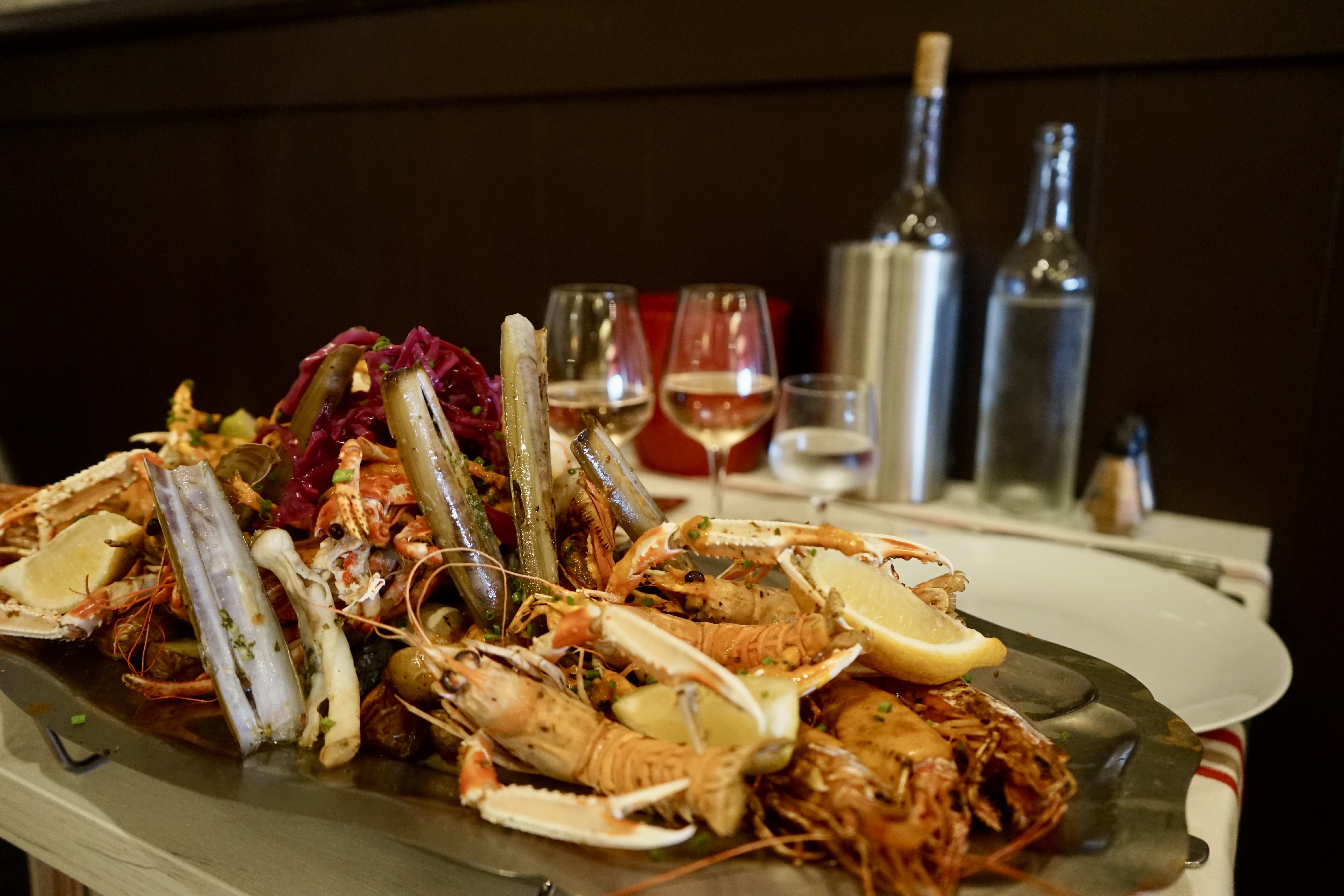 Homard, gambas, langoustines, moules, palourdes, couteaux. Accompagnée d'une sauce ibérique et de pommes de terre grenailles